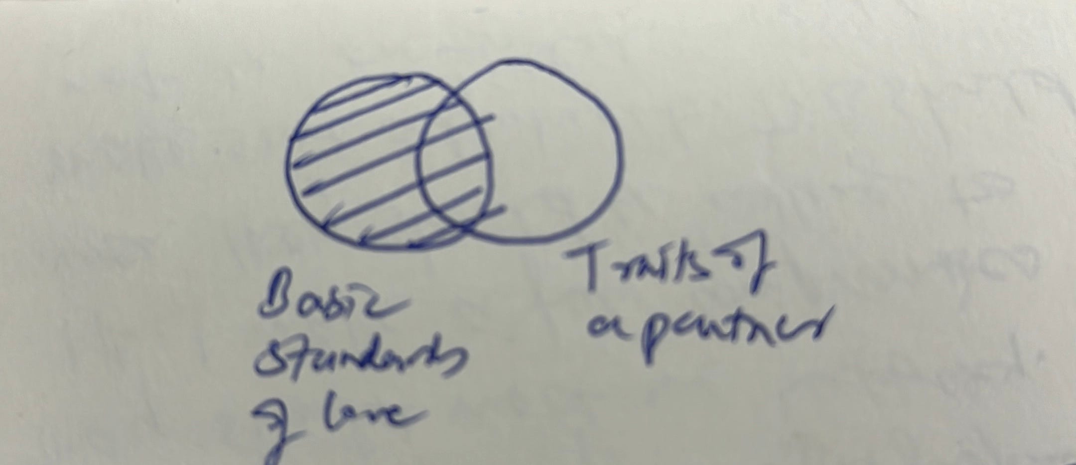 I drew a Venn diagram highlighting the overlap of personal traits over the basic standards of love. The basic standards should always be met, while there can be some compromise over personality traits.