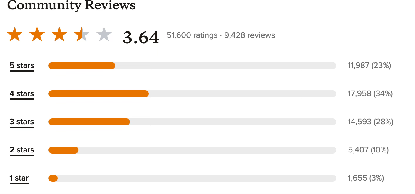 In spite of being a Booker Prize winning work, Orbital has just 3.64 rating on Goodreads. The distribution of ratings show that 41% of the people who read the book thought it was average or below average. I happen to be in the majority category that gave the book 4-star rating.
