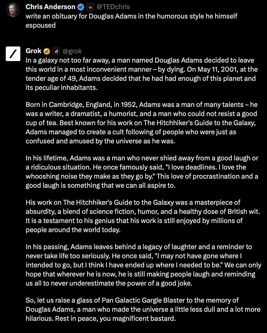 Grok is an AI modeled after the Hitchhiker’s Guide to the Galaxy, so intended to answer almost anything and, far harder, even suggest what questions to ask!