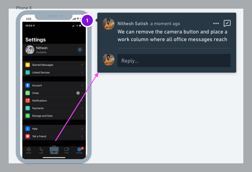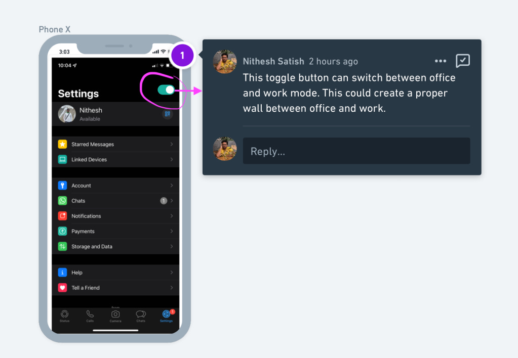 Sl NoSolutions to ensure work-life balance for WhatsApp usersEase of implementation (x/5)Pitfalls (-x/5)Overall Score1aRemove the camera column and replace it with a work messages column on WhatsApp (see image 1). All work messages land in this column automatically. EasyUsers will still receive messages when they are done with work. 5-2=31bAllow users to toggle between work mode and regular mode. When users are in work mode, they will receive only work messages. In regular mode, they will not receive any work messages. (see image 2)HardUsers might miss critical messages from home when they are at work (and vice versa)4-2=21cEnable users to temporarily block all office mates when they are not working. MediumThis could increase friction between colleagues. It has a sort of unpleasant feeling. 4-3=1
