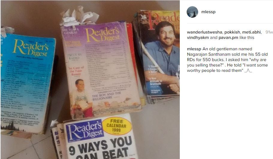 I looted 55 copies and a novel as well from this gentleman. I had been meaning to write this post for a long time, but for some reason or the other, I had been postponing it. I randomly pick an RD every now and then and flip some pages. Even today, I did the same. Fortunately, I had time, energy and the mood to sit down and write about this pleasant experience in Madras about 91 week ago (as my Instagram post indicates).