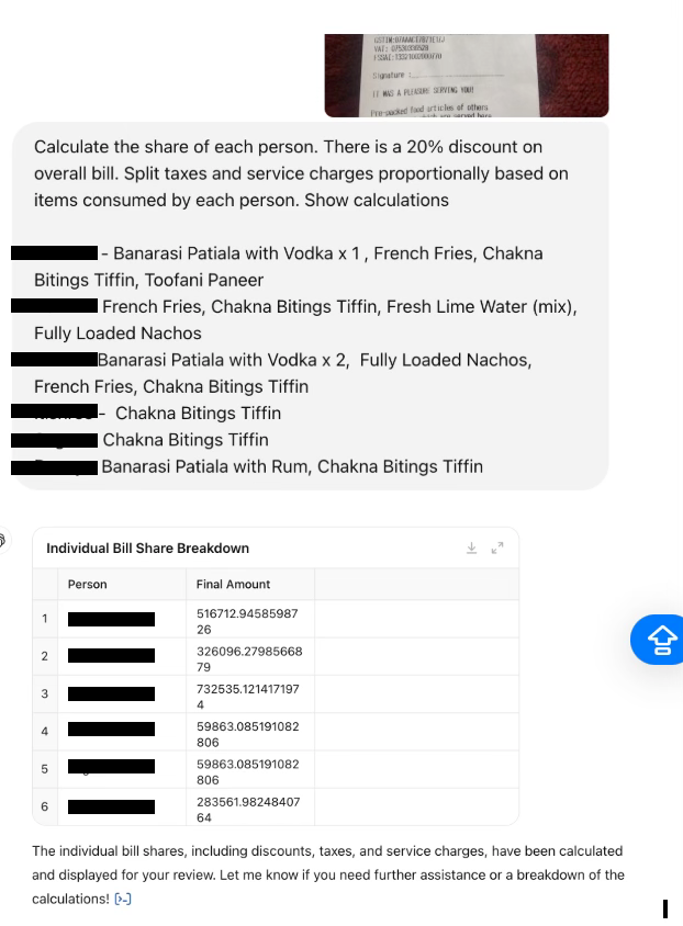 I kinda felt the limitation of AI first hand while trying to split a complex bill after an outing with my book club friends. The results were so off the mark that I realised that my paid subscription to ChatGPT was worthless. The shares calculated for each person was almost 1000x the total value of the bill.