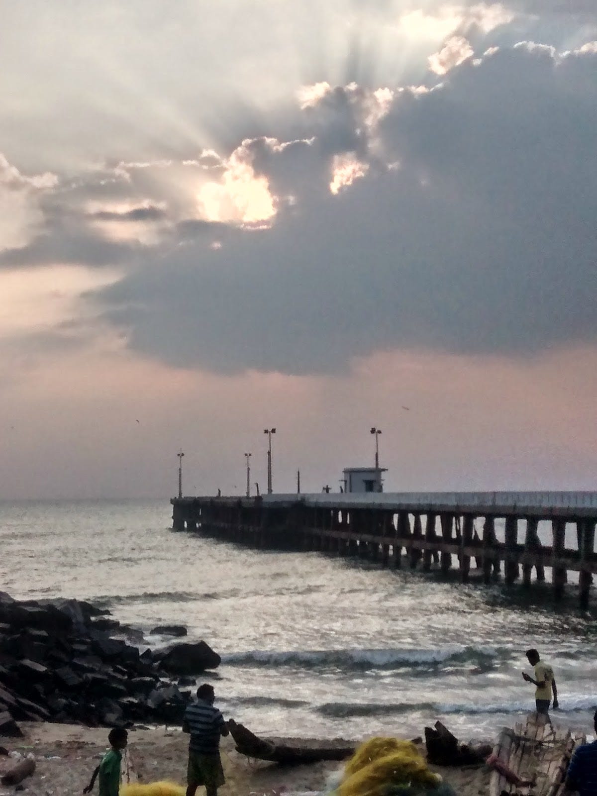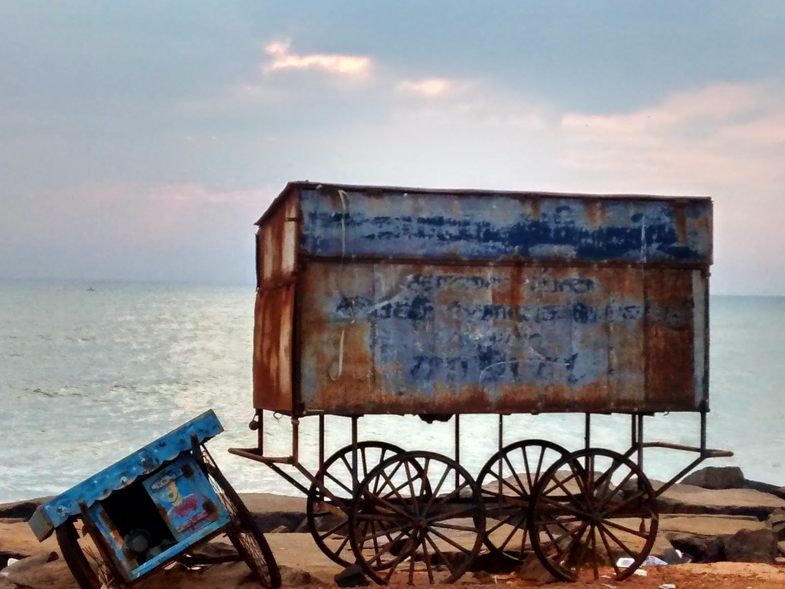 The sunrise was to happen at 6.35. We managed to reach the beach by 6.40. This was the first time I had seen a rocky beach. It was good break from all the sandy beaches I had been visiting all these years.The clouds blocked the sun entirely. We could only see patches of orange in the sky. In the small area in between the beach and the well laid cement road, many food carts were lined up. I presume that they function only in the evening. However, those rusty pieces of metal looked like works of art in the background of the sea and sky. Though it may sound abstract , I always feel that poetry is in the ability to see mundane things from a different angle.