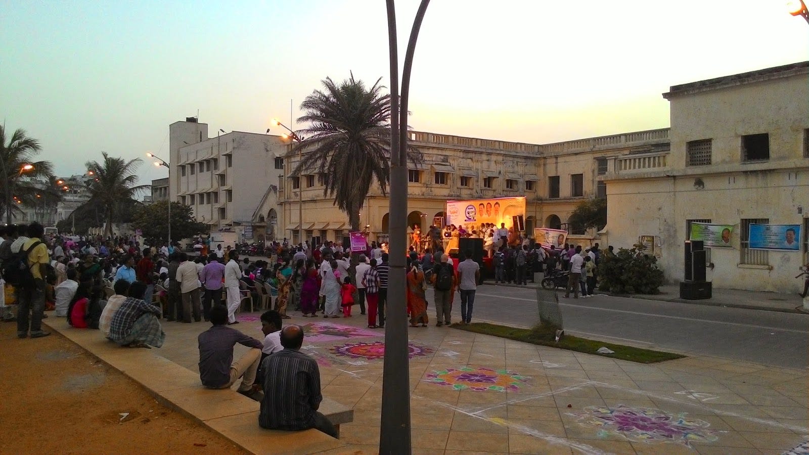 We were adequately distracted by the Rangoli competition that was happening on the Goubert Avenue (the road running parallel to the rocky beach). Hundreds of participants were busy drawing patterns and other themes on the lane.
