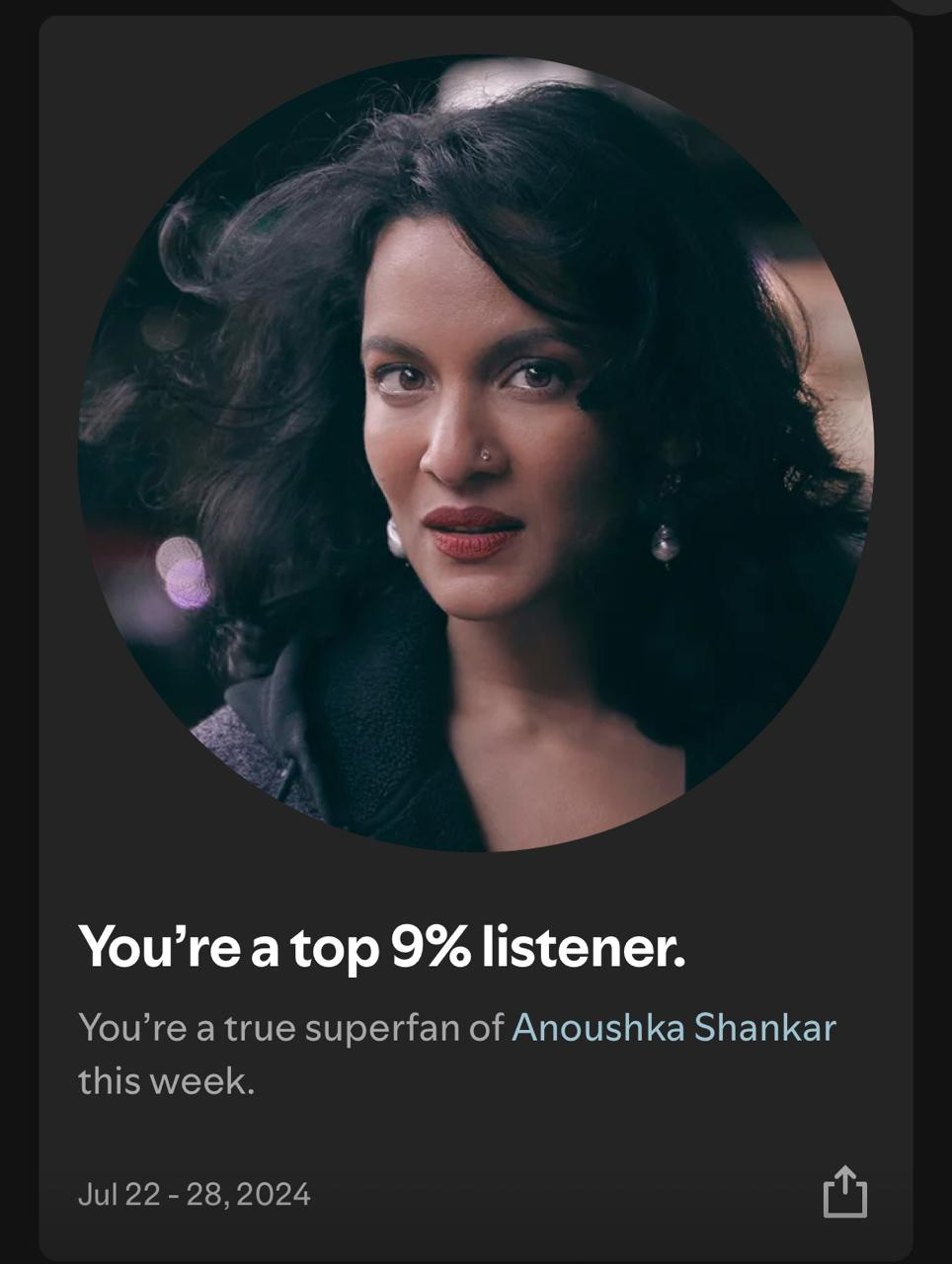 Today, I shared this image from my Spotify app to Instagram because I felt incredibly proud to be a top fan of Anoushka Shankar.