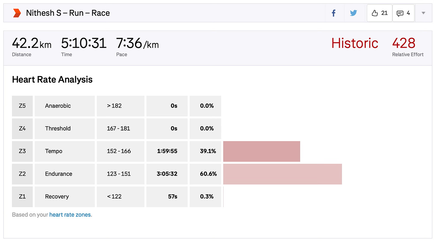 Another point to be happy about is regarding aerobic efficiency. The average heart rate for the marathon was 149 BPM. The max heart rate was 164 BPM. This could have been pushed up, but the limiting factor must have been my ankle and knee strength which needs more attention.