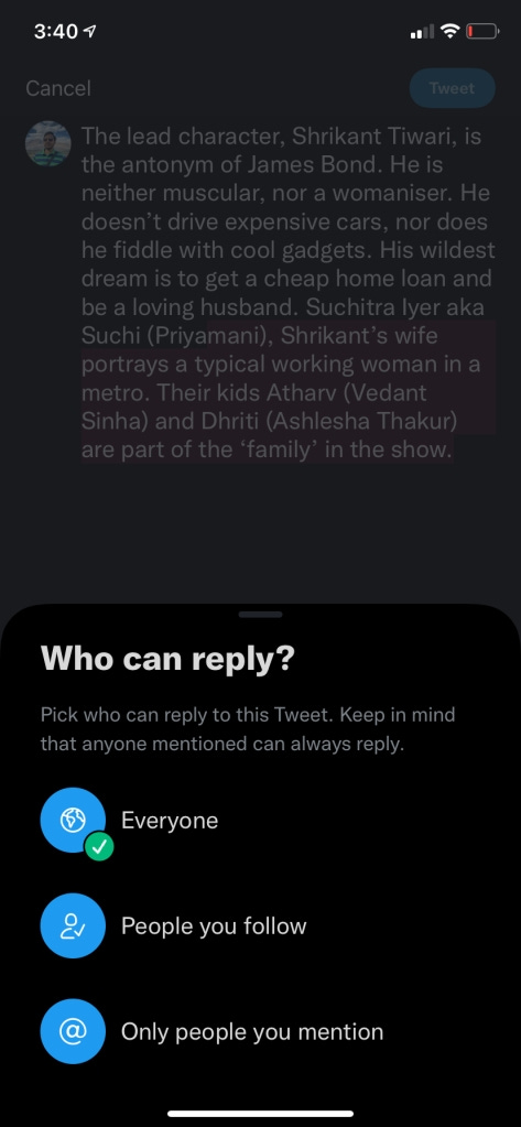 Twitter empowers the user to decide who can interact with the tweet in the replies. Before you send out the tweet, you can control who can reply to your tweets (to avoid potential trolls).